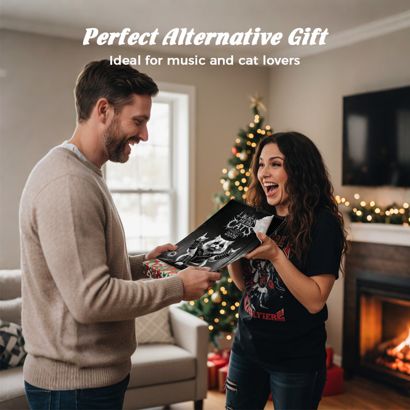 Masterfully blends dark black metal aesthetics with charming cats – a one-of-a-kind decor piece! Stand out from generic calendars and spark fun conversations with guests, whether in your home or office.