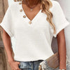 V-neck, short-sleeved, button design, loose fit, solid color, plain color T-shirt, comfortable and lovely women's summer T-shirt. This short-sleeved knit shirt is ideal for summer, fall and spring.